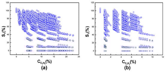 Furthermore, the cross-sensitivities of ethane and propane to methane are shown in Figure 7a,b, respectively. Based on the facts we discussed above, it is concluded that the concentration of each gas in mixed gases cannot be read using the linear system. So, we use the MLP NN system to eliminate the cross-sensitivity.