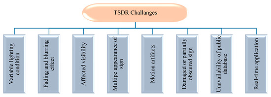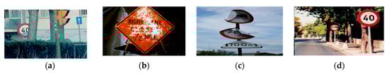 In all countries of the world, the important information about the road limitation and condition is presented to drivers as visual signals, such as traffic signs and traffic lanes. Traffic signs are an important part of road infrastructure to provide information about the current state of the road, restrictions, prohibitions, warnings, and other helpful information for navigation [1,2]. This information is encoded in the traffic signs visual traits: Shape, color and pictogram [1]. Disregarding or failing to notice these traffic signs may directly or indirectly contribute to a traffic accident. However, in adverse traffic conditions, the driver may accidentally or deliberately not notice traffic signs [3]. In these circumstances, if there is an automatic detection and recognition system for traffic signs, it can compensate for a driver’s possible inattention, decreasing a driver’s tiredness by helping him follow the traffic sign, and thus, making driving safer and easier. Traffic sign detection and recognition (TSDR) is an important application in the more recent technology referred to as advanced driver assistance systems (ADAS) [4], which is designed to provide drivers with vital information that would be difficult or impossible to come by through any other means [5]. The TSDR system has received an increasing interest in recent years due to its potential use in various applications. Some of these applications have been well defined and summarized in [6] as checking the presence and condition of the signs on highways, sign inventory in towns and cities, re-localization of autonomous vehicles; as well as its use in the application relevant to this research, as a driver support system. However, a number of challenges remain for a successful TSDR systems; as the performance of these systems is greatly affected by the surrounding conditions that affect road signs visibility [4]. Circumstances that affect road signs visibility are either temporal because of illumination factors and bad weather conditions or permanent because of vandalism and bad postage of signs [7]. Figure 1 shows an example of some non-ideal invariant traffic signs. These non-identical traffic signs cause difficulties for TSDR.