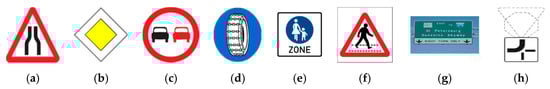 Aiming at standardizing traffic signs across different countries, an international treaty, commonly known as the Vienna Convention on Road Signs and Signals [8], was agreed upon in 1968. To date, 52 countries have signed this treaty, among which 31 are in Europe. The Vienna convention classified the traffic signs into eight categories, designated with letters A–H: Danger/warning signs (A), priority signs (B), prohibitory or restrictive signs (C), mandatory signs (D), special regulation signs (E), information, facilities or service signs (F), direction, position or indication signs (G), and additional panels (H). Examples of traffic signs in the United Kingdom for each of the categories are shown in Figure 2.