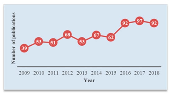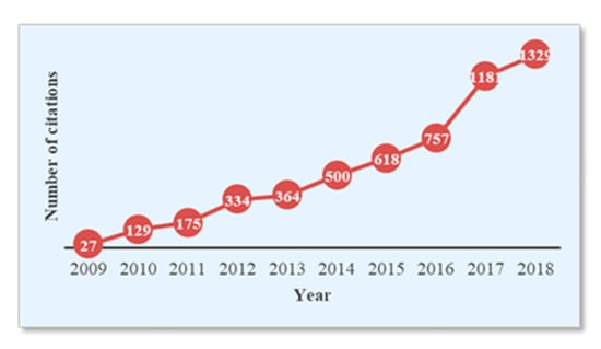 In terms of research, recently there has been a growing interest in developing efficient and reliable TSDR systems. To show the current state of scientific research regarding this development, a simple search of the term “traffic sign detection and recognition” in the Scopus database has been carried out, with the aim of locating articles published in journals indexed in this database. To focus on the recent and most relevant research, the search has been restricted to the past decade (2009–2018) and only in the subjects of computer science and engineering. In this way, a set of 674 articles and 5414 citations were obtained. The publication and citation trends are shown in Figure 3 and Figure 4, respectively. Generally, the figures indicate a relatively fast growth rate in publications and a rapid increase in citation impact. More importantly, it is clear from the figures that TSDR research has grown remarkably in the last three years (2016–2018), with the highest number of publications and citations representing 41.69% and 60.34%, respectively.