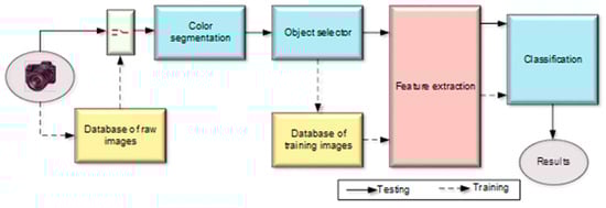 As aforementioned, a TSDR is a driver supportive system that can be used to notify and warn the driver in adverse conditions. This system is a vision-based system that usually has the capability to detect and recognize all traffic signs, even those signs that may be partially occluded or somewhat distorted [14]. Its main tasks are locating the sign, identifying it and distinguishing one sign from another [15,16]. Thus, the procedure of the TSDR system can be divided into three stages, the detection, tracking and classification stages. Detection is concerned with locating traffic signs in the input scene images, whereas classification is about determining what type of sign the system is looking at [17,18]. In other words, traffic sign detection involves generating candidate region of interests (ROIs) that are likely to contain regions of traffic signs, while traffic sign classification gets each candidate ROI and tries to identify the exact type of sign or rejects the identified ROI as a false detection [4,19]. Detection and classification usually constitute recognition in the scientific literature. Figure 6 illustrates the main stages of the traffic sign recognition system. As indicated in the figure, the system is able to work in two modes, the training mode in which a database can be built by collecting a set of traffic signs for training and validation, and a testing mode in which the system can recognize a traffic sign which has not been seen before. In the training mode, a traffic sign image is collected by the camera and stored in the raw image database to be classified and used for training the system. The collected image is then sent to color segmentation process where all background objects and unimportant information in the image are eliminated. The generated image from this step is a binary image containing the traffic sign and any other objects similar to the color of the traffic sign. The noise and small objects in the binary image are cleaned by the object selector process and the generated image is then used to create or update the training image database. According to [20], feature selection has two functions in enhancing the performances of learning tasks. The first function is to eliminate noisy and redundant information, thus getting a better representation and facilitating the classification task. The second function is to make the subsequent computation more efficient through lowering the feature space. In the block diagram, the features are then extracted from the image and used to train the classifier in the subsequent step. In testing mode, the same procedure is followed, but the extracted features are used to directly classify the traffic sign using a pre-trained classifier.
