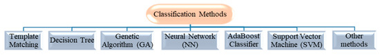 After the localization of ROIs, classification techniques are employed to determine the content of the detected traffic signs [1]. Understanding the traffic rule enforced by the sign is achieved by reading the inner part of the detected traffic sign using a classifier method. Classification algorithms are neither color-based nor shape-based. The classifier usually takes a certain set of features as the input, which distinguishes the candidates from each other. Different algorithms are used to classify the traffic signs swiftly and accurately. Some conventional methods used for classification of traffic signs are outlined in Figure 12 and reviewed respectively in Table 6, Table 7, Table 8, Table 9, Table 10, Table 11, Table 12 and Table 13.