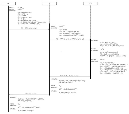 Step 5: This step is invoked by . After receiving the authentication response message , computes and . Then, checks if . is correct or not. If the verification process is correct, computes and replaces with .