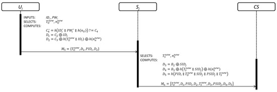 Step 4: This step is invoked by . Yet receiving the authentication response message , computes and . Then, checks if is correct or not. If the verification process is correct, computes and replaces with . Finally, sends to through an open communication channel.