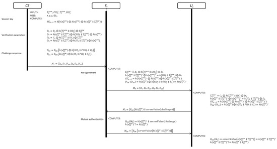 In our scheme, computes , using Equation (15), which contains information from and , making unique the value of . Then, verifies the connection attempt between and by means of Equation (23). Moreover, computes the session key using information of , and .