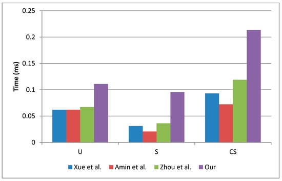 Figure 7 shows the computational-cost comparison by participant and scheme. In this case, we used the execution-time of the case 1. The main difference between our scheme and previous works is the inclusion of symmetric operations during the authentication phase. The symmetric operations are used to provide mutual authentication between and , increasing the security of the proposed scheme.