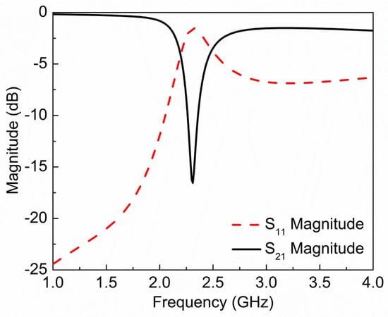 Magnitude of simulated reflection (S11) and transmission (S21) coefficient for the proposed sensor. Resonance frequency of sensor is 2.32 GHz with notch depth −16.54 dB.