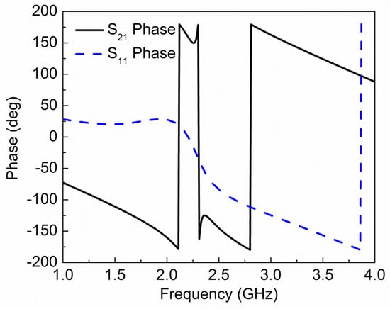 Phase of simulated reflection (S11) and transmission (S21) coefficient for the proposed sensor. A sudden change in phase occurs at resonance frequency.