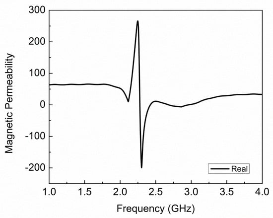 Extracted plot of magnetic permeability for proposed sensor, showing negative permeability from 2.27 GHz to 2.42 GHz, and maximum value of negative permeability is −199.2 at 2.30 GHz.