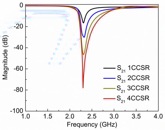 Simulated transmission coefficient of proposed sensor with one, two, three, and four complementary circular spiral resonator (CCSR) in the ground plane separated 1 mm apart. By increasing number of CCSR in the ground plane, notch depth and bandwidth increase but resonance frequency remains the same.