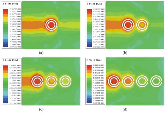 Distribution of electric field at resonance of proposed sensor based on (a) one CCSR, (b) two CCSR, (c) three CCSR, and (d) four CCSR.