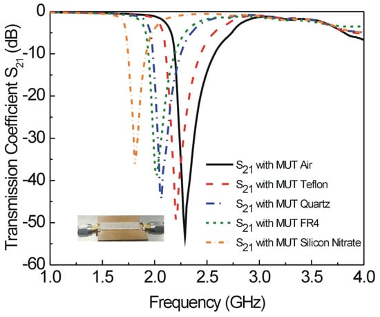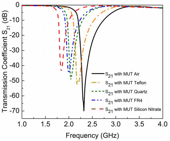 where ∆fr, ∆ε, ∆µ are change in resonance frequency, permittivity, and permeability, respectively. υ is the perturbed volume. E0 and E1 are the electric fields distribution without and with perturbation, respectively. H0 and H1 are the magnetic fields distribution without and with perturbation, respectively. For sensitivity analysis, we selected the sensor based on four CCSR structures due to its sharp transmission curve. MUT is placed in the ground plane without air gap as shown in Figure 8. Sensitivity analysis is performed on permittivity perturbation of MUTs. Four MUTs (teflon, quartz, FR4, and silicon nitrate) with constant dimension (6 mm × 27 mm × 1 mm) are placed under the ground plane and their impact on transmission coefficient of the sensor is shown in Figure 9. Simulated resonance frequencies of the sensors due to interaction with air, teflon, quartz, FR4, and silicon nitrate are 2.32 GHz, 2.17 GHz, 2.04 GHz, 2.0 GHz, and 1.84 GHz, respectively. From Figure 9, it is clear that the relative permittivity of the MUT is inversely proportional to the resonance frequency of the sensor. Permittivity of MUT basically changes the total capacitance of the device, and resonance frequency due to interaction with MUT can be calculated as follows [15]: