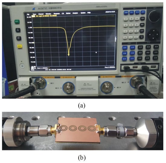 The sensor based on four CCSR structures is fabricated on FR4 substrate using standard PCB fabrication technique and the fabricated prototype is shown in Figure 10b. Vector network analyzer (AV3672series) is used for measurement of transmission coefficient with a frequency sweep of 1 to 4 GHz as shown in Figure 10a. The fabricated sensor is used to measure the resonance frequencies of sensors due to interaction with air, teflon, quartz, FR4, and silicon nitrate as shown in Figure 11. Measured resonance frequencies of the sensors due to interaction with air, teflon, quartz, FR4, and silicon nitrate are 2.29 GHz, 2.20 GHz, 2.06 GHz, 2.02 GHz, and 1.82 GHz, respectively. For comparison, simulated and measured results for the sensor are tabulated in Table 3. The differences between simulated and measured results are very small and can be attributed to fabrication tolerance, conductor, dielectric and radiation losses.