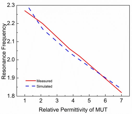 Relative permittivity of MUT versus resonance frequency of the sensor obtained by EM simulation and Equation (14).