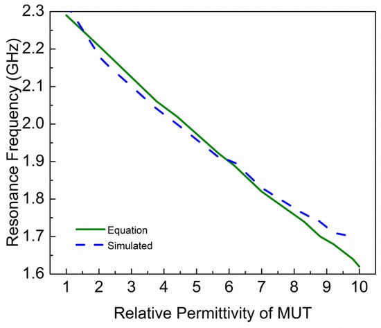 Equation (14) can be used to predict resonance frequency of known MUTs with permittivity ranges from 1 to 10. To check validity of Equation (14), various MUTs are placed on the sensor and resonance frequencies are extracted through Electromagnetic (EM) simulation. In Figure 13, the solid line shows the resonance frequencies extracted from Equation (14) and dash line shows the resonance frequencies extracted through simulation. It is clear that Equation (14) is fairly reliable for the prediction of resonance frequency of the sensor due to the interaction with MUTs of permittivity ranges up to 10. To calculate the relative permittivity of unknown MUT, the transcendental equation can be expressed as: