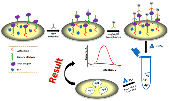 The produced Ab@AgNP bioconjugates can be used in diagnostics as an analytical tool for the determination of antibodies to TBEV. To assess the quality of the produced Ab@AgNP bioconjugates, an electrochemical immunosensor was developed and CLS voltammograms of Ag in the Ab@AgNP bioconjugates as a direct signalling marker were recorded. The preparation and characterization of the electrochemical immunosensor were performed in several steps and is presented in Figure 1.