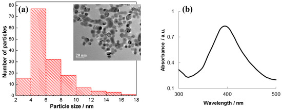 At first, spherically shaped Ag NPs (5.3 ± 1.2 nm in size) were synthesized, purified by dialysis, and characterized by TEM and UV/Vis spectrophotometry (Figure 2). In the UV/Vis absorption spectra (Figure 2b), the maximum absorption of Ag NPs is in the range of 395–400 nm, which is in accordance with the average Ag NP size of 5.3 ± 1.2 nm calculated from the TEM observations (Figure 2a) [14]. The zeta potential of the Ag NPs was found to be −42 mV. This large negative zeta potential value indicates repulsion among the Ag NPs and their dispersion stability.