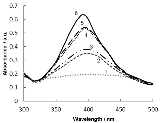It can be seen that BSA addition shifts the maximum of the UV/Vis absorption spectra of Ag NP to longer wavelengths (400–405 nm) as compared to the absorption maximum of the Ag NPs without the BSA (Figure 4, curve 6). It confirms that BSA stabilizes the Ag NPs, probably via several amino acids present in BSA (e.g., histidine, cysteine, aspartic and glutamic acid), which promote its binding with metal salts. In particular, moieties of BSA with sulphur-, oxygen-, and nitrogen-bearing groups can stabilize the nanoparticles. Of these, thiol-bearing cysteine residues are likely to interact with Ag NPs more strongly via direct chemical bonding, thus providing steric stabilization [21].