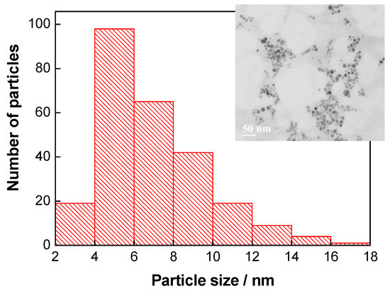 TEM-derived Ag NP size distribution in the presence of blocking reagent (BSA) (16 µg·mL−1) and TEM image of Ag NPs in the presence of BSA (16 µg·mL−1) (inset).
