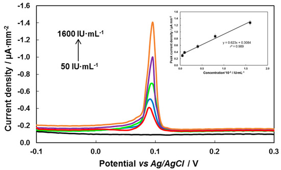 Cathodic linear sweep voltammograms of AgCl at the gold–carbon composite electrode (GCCE); black line—without the antigen immobilized on the immunosensor surface; coloured lines—antigen immobilized on the electrochemical immunosensor with the different concentration of antibodies (50, 100, 400, 800, 1600 IU·mL−1). Inset plot: corresponding calibration curve (error bars for n = 5, P = 0.95) in supporting electrolyte of 0.15 mol·L−1 HNO3 and 0.01 mol·L−1 KCl. Scan rate of 100 mV·s−1, Eacc = −0.8 V, tacc = 60 s.