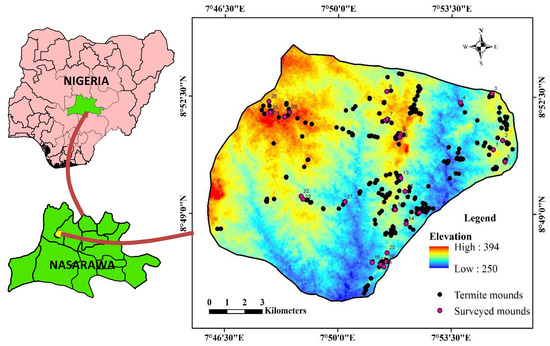 Termites are among the most emphatic and important soil organisms in tropical ecosystems [1,2,3]. Their nests (also called mounds) are constructed from surrounding soils but differ from the surrounding soil matrix in terms of physical and chemical compositions due to termite reworking of the soils to modify its porosity, water infiltration capacity, and pH level, among others [4,5,6,7]. These mounds often materialize into islands of enhanced soil water availability to support lush vegetation in dry periods or environments [8,9]. This is similar to vegetation lineaments where lush vegetation follows the surface traces of faults, rock boundaries (such as dyke intrusion into country rock) and valleys along stream channels as a result of the wetter subterranean conditions in those environments [10]. Fault zones, fractured dykes and valleys are excellent localities for groundwater prospecting as they serve as conduits through which groundwater preferentially flows [11].
