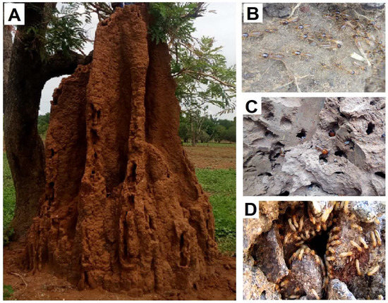 Termite mound and live termite species encountered in the study area. (A) Cathedral shaped termite mound, (B) Nasutitermes species, (C) Macrotermes species, (D) Coptotermes species.
