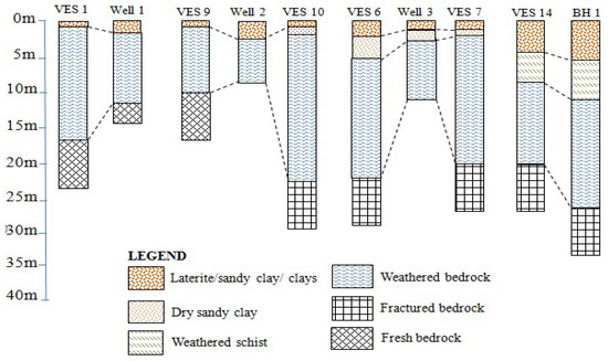 The interpretation of VES data can be ambiguous and only when adequate knowledge of surface geology and established good controls through well-logs are available can a reliable interpretation be established (e.g., [40,72,73]). For this reason, three termite mounds/VES points were located in close proximity to dug-wells and one other to a deep borehole. Analysis of the wells and borehole lithological logs were used as constraints to guide the VES interpretation. Good correlations were found between the litho-logs and the VES interpreted results (Figure 5).
