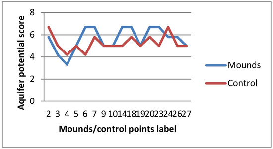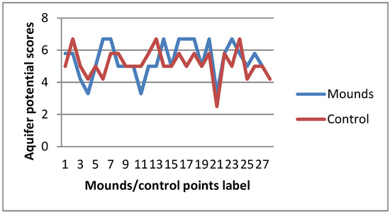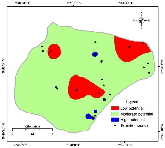 There is no visible influence of the activeness or otherwise of mounds on aquifer potential. This is probably because the original builders and/or later colonists have destroyed the crust below during the active periods of the mounds. The destroyed crust would likely remain long after the mound occupants have deserted [4]. Termite mounds without canopy protection are more likely to indicate good aquifer potential compared to those under tree canopies. However, this likelihood is not statistically significant (U = 69.5, p = 0.579). Based on the 28 VES points from termite mound sites, the aquifer potential map was prepared. Weighted mean potential values ranged from 3.3 to 6.7 and where thus categorized into 3 classes of 3.30–5.00, 5.01–6.50 and 6.51–6.70 for low potential, moderate potential, and high potential, respectively.