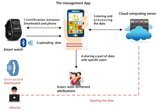 - Private data leakage: We assume that the cloud and the data requester are honest, but curious; this means they would obey the workflow, but want to obtain other entities’ private information. Meanwhile, it is surprising that most transmission data channels between smart watches and the cloud server are public and unencrypted [43]. An attacker can obtain user information by sniffing. Moreover, even if user data traffic is encrypted, the cloud server can attempt to decrypt with a powerful computational capability. Besides, other users attempt to use their own attributes to obtain the private key for decrypting information.