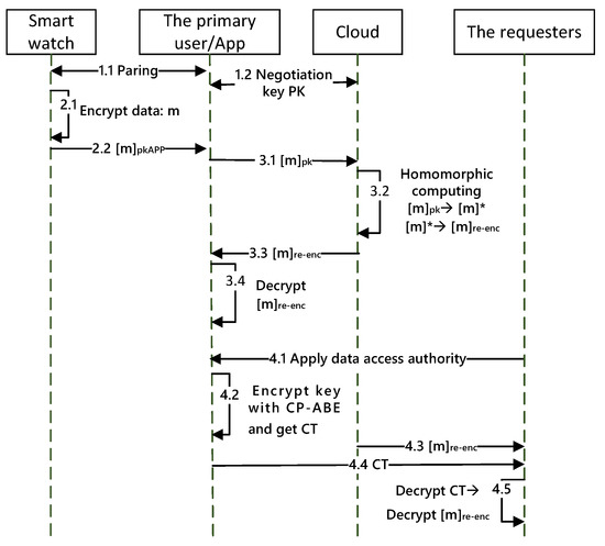 - System setup: All entities except the smart watch call the algorithm KeyGen. The APP and the users call the algorithm CP-ABE-setup to complete the initialization of the homo-re-encryption and CP-ABE.