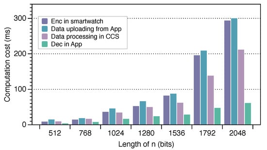 The entire protocol overhead is mainly generated by these three parts mentioned above. The overhead of transmitting data is mainly generated by the data encryption watch-enc. The data generally is health data or user location information monitored by the smart watch. This time is closely related to the data length n. Therefore, we could perform a time comparison by setting the data length to (512, 768, 1024, 1280, 1536, 1792, 2048) bits, respectively. The results are shown in Figure 6. Although the overhead is increasing with the length of the data, the data such as steps or heart rate are produced intermittently and are not too large. Hence, the overhead is still affordable. We can ignore the time when the encrypted data were uploaded to the cloud computing server. We pay more attention to the time overhead of the cloud computing server for data processing, including the encrypted data homomorphic operation and the re-encrypted computing part. This time of re-encrypted computing was also related to the length of the data. The overhead results are shown in Figure 6. Similarly, the overhead of FPAS is acceptable for mobile phones and negligible for the cloud. As for the time spent by the App controlling the access rights, this was mainly generated by the CP-ABE. Depending on the granularity of the permissions, different numbers of attributes could be used to describe the identity of a user. Different numbers of attributes bring different time overhead. We set the number of attributes as (1, 2, 3, 4, 5) for testing the time required in our scheme. We divide the whole process into encryption, different decryption keys’ generation, and decryption according to different attributes. The results are shown in Figure 7.