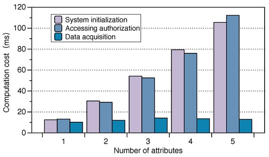 Computational complexity. We analyzed the computational complexity of CP-ABE. First, we based this on the assumption that universal attributes exist, attributes are in the access tree A, and that at most s attributes satisfy the access tree A for decrypting [30]. For the setup algorithm CP-ABE-Setup, it needs to do one exponentiation and one bilinear pairing. The encryption algorithm CP-ABE-Encrypt needs to encrypt the message by each attribute in A with two exponentiations and encrypt the message with one exponentiation and one bilinear pairing. Therefore, it needs to do exponentiations and one bilinear pairing in total. The key generation algorithm CP-ABE-KeyGen also does exponentiations and one bilinear pairing. CP-ABE-Decrypt operates at most s bilinear pairings and s exponentiations to decrypt the ciphertext. Though the computational cost of CP-ABE is higher than KP-ABE [30], it has safer performance, and the primary user can control the access authority. Considering the improvement on the security level, this amount of overhead is reasonable.