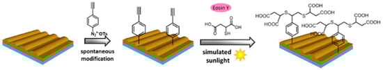 Modified gold gratings were immersed in 10 ml of 20 mM solution mercaptosuccinic acid with 4 mg of Eosine Y in acetonitrile. Afterwards, samples were placed in a visible range photoreactor (Dr Honle, UVA CUBE 400 model) for 1 h. Afterward, reaction samples were washed by acetonitrile (3 times), methanol (3 times), and acetone (3 times).