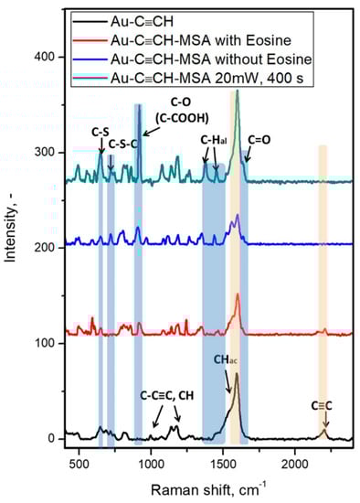 In order to achieve the full conversion of surface groups, we implemented the new approach, recently developed by Ananikov, utilizing Eosin Y as a photocatalyst []. The simple addition of Eosin Y to the solution of MSA followed by irradiation of gratings in the sunlight-simulator led to the full conversion of surface ethynyl-groups with the formation of appropriate thioethers. After the reaction, Raman spectra of the surface changed dramatically. Firstly, the most character adsorption band of C≡C at 2198 cm−1 disappeared, indicating full conversion of the reaction. Moreover, Raman signals at 1634 cm−1 (C=O stretch), 1467 cm−1 (in-plane OH bending), 1248 and 850 cm−1 (OH deformational vibrations), and 520 cm−1 (O-C-O) reveal the presence of free carboxyl groups on the surface in the structure of grafted MSA.
