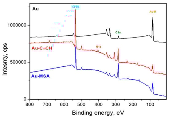 Also, XPS permitted the confirmation of the grafting of -C6H4-C≡CH aryl groups to gold, as shown in Figure 3. The covalent modification has resulted in a significant increase of the inelastic background of the gold platform in comparison with the background recorded with bare gold gratings. Attenuation of gold not only induces lower relative peak intensity of gold core level peaks, but also an increase in the inelastically scattered gold photoelectrons, hence the concave-shaped background [,]. This is exacerbated after attachment of the second layer (MSA).