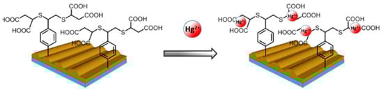 Recently we reported the simple and reliable SERS sensor based on periodic gold grating for the detection of heavy metal ions []. The combination of optimal SERS-response with a specific recognition layer—which can be formed via diazonium chemistry—allowed us to determine heavy metal ions with a limit of detection (LOD) of 10−14 M. Nevertheless, the design of highly selective sensors towards mercury ions is still in great demand [,,,,,]. Obviously, this task can be solved using an appropriate recognition layer with high affinity to the mercury ions.