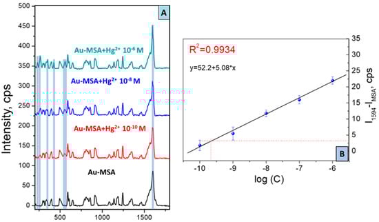 The standard linear curve was plotted in the coordinates log (Hg2+ concentration)—the intensity of peak at 1594 cm−1 (attributed to binding state) after subtraction of intensity at 1594 cm−1 on Au-MSA sample, as shown in Figure 5. The standard curve of the solution (Hg2+) obeys the equation Y = 52.2 + 5.08 × X, which shows a perfect relationship with a linear character and correlation coefficient of 0.9934. According to IUPAC recommendations, the minimally acceptable signal intensity must be three times greater than the background signal deviation, i.e., the intensity of the shifted MSA peak should have an absolute value equal to 3.12. As is depicted in Figure 5, this intensity approximately corresponded to 10−9.61 M. The LOD of sensor 10−9.61 M is equivalent to 0.049 μg/L; these results imply that quantitative analysis would be feasible in this concentration range. Such a detectable level is much lower than the maximum contaminant level of mercury (2 µg/L) accepted in drinking water and continuous concentrations (0.77 μg/L) of fresh water according to mercury regulation in the United States and Europe [,]. The SERS sensor designed so far can thus confidently be employed for water monitoring. Therefore, it can be concluded that the SERS response of the sensor is specific to the Hg2+ ion, as shown in Figure 7B. The prepared sensor can compete with world analog sensor systems, taking into account the values of LOD, selectivity, time of analysis, and portability of device [,,,,,,].
