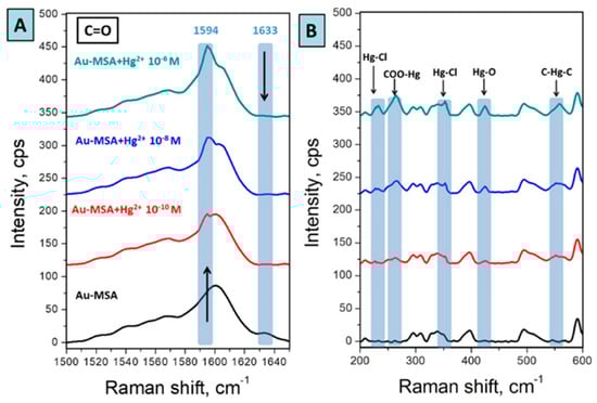 (A) Dependence of C=O peak shift in the dependence of Hg2+ concentration; (B) Enlarged area (200–600 cm−1) of SERS spectra from Figure 4, indicating the formation of a complex of MSA with Hg2+.