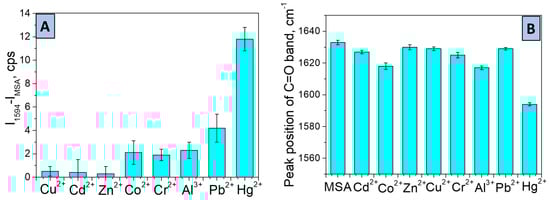 The negligible increase of intensity was found in the case of Co2+, Al3+, and Cr2+, probably due to physical sorption on the gold surface and more evident increases in the case of Pb2+ due to structural similarity to targeted Hg2+. As we found before, the position of the Raman signal, responsible for the C=O bond in the structure of chelating functional groups like DTPA can vary after interaction with metal ions due to the formation of complexes. Therefore, we also demonstrated the dependence of peak position of the C=O band on the type of metal ion (Cu2+, Cd2+, Zn2+, Co2+, Cr2+, Pb2+, Al3+, Hg2+) after interaction with Au-MSA gold grating for 20 min, as shown in Figure 7B. In the case of detection of targeted Hg2+ ions, the shift of the C=O peak position was found to be 39, whereas, for all other metals, this value did not exceed 10, except for Co2+ and Pb2+ (value of shift is 18 and 16, respectively). Therefore, it can be concluded that the SERS response of the sensor is quite specific to the Hg2+ ion, as shown in Figure 7B.
