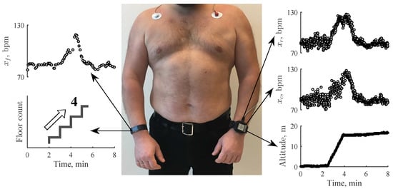 Data collection took place indoors at Santaka Valley, Kaunas, Lithuania. A wrist-worn device, developed at Biomedical Engineering Institute of Kaunas University of Technology (Kaunas, Lithuania) was used for synchronously acquiring electrocardiogram (ECG), PPG, and barometric pressure. The analog front-end ADS1296R (Texas Instruments, Dallas, TX, USA) was used to acquire ECG at a sampling rate of 500 Hz, the analog front-end AFE4404 (Texas Instruments, Dallas, TX, USA) to acquire PPG at 100 Hz, and the sensor MS5611-01BA03 (TE Connectivity Ltd., Schaffhausen, Switzerland) to acquire barometric pressure at 50 Hz with an altitude resolution of 10 cm. Heart rate from the PPG signal was determined using a peak detector similar to the one described in []. For comparison, heart rate and climbed floors were obtained using a smart wristband Fitbit Charge 2 (Fitbit, San Francisco, CA, USA). It should be noted, that the consumer smart wristband does not provide access to the raw PPG signal, but rather heart rate at intervals of five seconds or longer, depending on the signal quality.