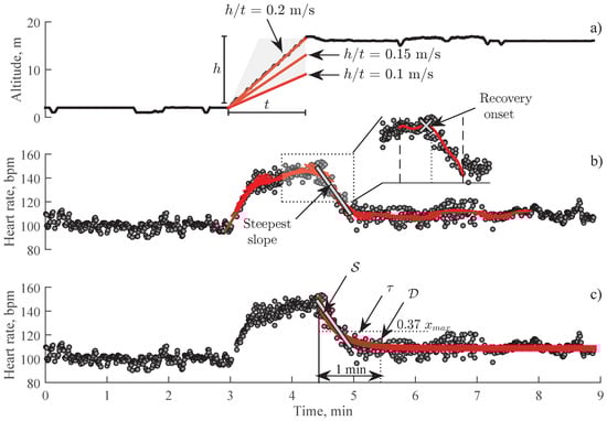 Estimation of heart rate recovery (HRR) parameters in heart rate series with a stair climbing activity: (a) altitude with the onset of stair climbing at 3 min, (b) detection of the steepest falling slope in a synchronously recorded heart rate series where the peak in the fitted polynomial corresponds to the recovery onset, (c) estimation of HRR parameters.