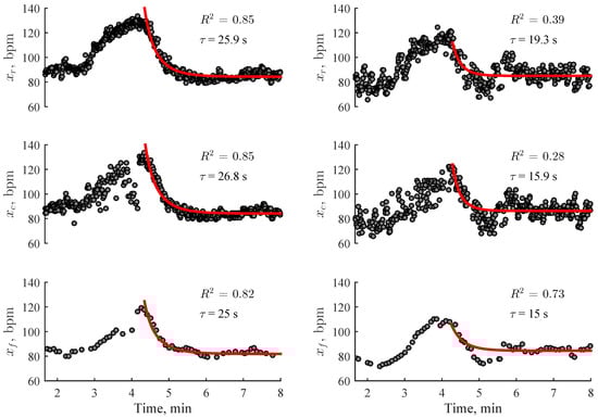 The exponential model is fitted in a time interval of 5 min, starting at the recovery onset. We assume that heart rate achieves at least 95% of full recovery within 5 min after the stair climbing activity. Based on this assumption, > 100 s was considered as a fitting error and therefore excluded from further analysis. The quality of exponential fitting is determined via the coefficient of determination . Fitting is considered acceptable when exceeds the empirically chosen fixed threshold of 0.5. Differently from other studies where larger thresholds were used to determine the acceptable fitting quality [], the decision for choosing lower threshold was based on the specialty of the stair climbing activity, which is less intensive than maximal or submaximal trendmill/ergometer exercise. Since heart recovers faster after stair climbing, manifestation of heart rate variability in the slow recovery phase may reduce considerably, despite exponential curve matches well with decay tendencies (Figure 4).