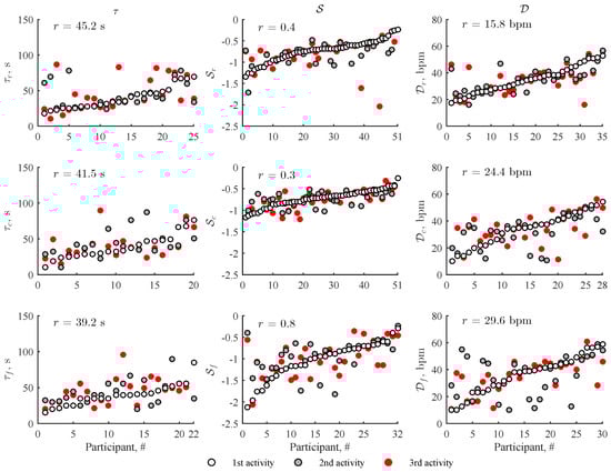 Repeatability of HRR parameters obtained for three consecutive stair climbing activities at a rate of 96 steps/min. The HRR parameter values are sorted with respect to the first stair climbing activity. Note that only those participants whose all three repeated stair climbing activities met the quality criterion of > 0.5 and had no corrupted segments were included in the repeatability study.