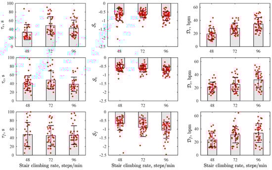 Figure 7 displays HRR parameters estimated at different stair climbing rates. The results show obvious dependence of parameter on a stair climbing rate, i.e., the difference between the heart rate at recovery onset and that after 1 min increases as climbing intensity increases. Similarly, the steepness of the recovery slope tends to slightly increase for higher climbing rates.