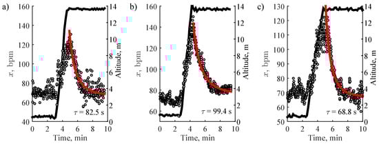 The rapid heart rate decay immediately after the recovery onset, which reflects parasympathetic reactivation, is characterized by the short-term time constant []. is found by fitting a linear polynomial to the logarithm of heart rate. Then, is the negative inverse of the slope of the resulting line, expressed as −1/slope. To ensure better reproducibility, is estimated within the first second after the recovery onset in a sliding window of 30 s and the lowest value is selected [].