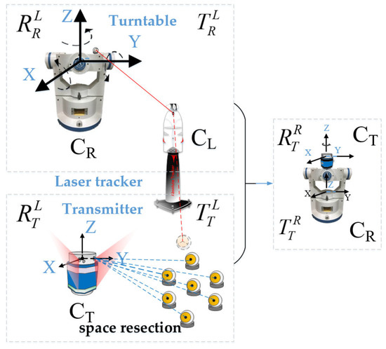 Still keeping the position of the laser tracker unchanged, we then fixed the transmitter on the turntable. Several spatial points were placed in the space and the coordinates of each point were measured by the laser tracker. For each spatial point, there were two corresponding scanning angles in the transmitter. As illustrated in Figure 2, with the coordinates of spatial fixed points and corresponding scan angles of each point, plane constraint equations could be established. Based on space resection, the spatial relationship between the transmitter coordinate frame and the reference coordinate frame could then be calculated. The rotation matrix and translation vector from the transmitter coordinate frame Ot-xtytzt (CT) to the reference frame Ol-xlylzl (CL) are defined as and . Finally, with the rotation matrixes and translation vectors of the turntable and transmitter with respect to the reference coordinate frame, the rotation matrix and translation vector from the transmitter to the turntable could be obtained, which are defined as and , and we have