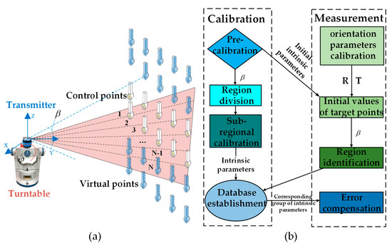 The sub-regional calibration mechanism and the error compensation algorithm. (a) The experimental schematic; (b) The algorithm structure.
