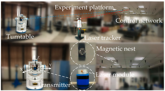A high-accuracy 3-axis turntable and a precise 3-D coordinate control network were used to carry out the novel calibration method. The angle position accuracy of 3-axis turntable is within 1″ along each rotation axis. The control network was established by the Leica AT901-LR laser tracker, whose measurement accuracy is 15 μm + 6 μm/m. The transmitter was designed and manufactured by Tianjin University, China. The angle measurement accuracy of the transmitter is 2.6″ (based on three standard deviations) [20]. The platform for calibration using the Leica AT901-LR laser tracker and the 3-axis turntable is shown in Figure 4.