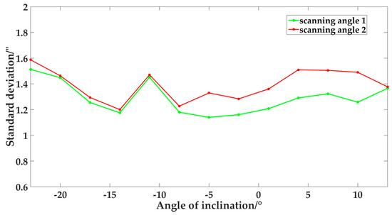 The wMPS is a type of distributed measurement system based on the principle of angle intersection, so the angle-measurement performance of the single transmitter is the core factor of this system, which is evaluated by the angle-measurement repeatability error. Before the formal calibration, we need verify the stability of angle-measurement performance of the transmitter with the change of transmitter posture. With the help of the turntable, we tested the angle-measurement performance of the transmitter at different inclination angles respectively, and the results of the comparison tests are shown in Figure 5. The ranges of the measurement repeatability error of the scanning angles 1 and 2 were respectively 0.38″ and 0.39″, which indicated that within a certain range, the angle-measurement performance of the transmitter had good stability with the change of inclination angle.