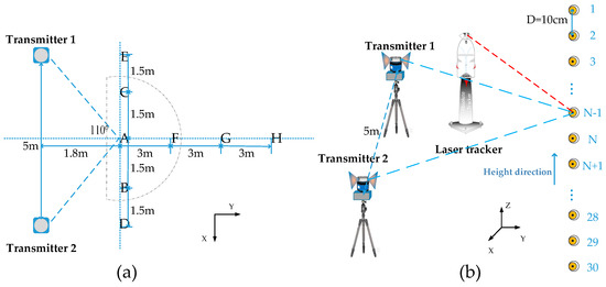 To verify the viability and effectiveness of the proposed error compensation algorithm, a series of comparison experiments were designed to compare the measurement precision between the conventional calibration method and the novel calibration method. The Leica AT901-LR laser tracker, whose accuracy is 15 μm + 6 μm/m, was required to supply standard coordinates. Two transmitters with a distance of 5 m from each other were set up to form a measurement network. As shown in the Figure 6a, we set up 8 sets of comparison experiments in the eight areas A, B, C, D, E, F, G, H. Based on the theory of optimal measurement area proposed by Xiong et al. [22], the intersection angle of the system with the best measurement effect was 110 degrees, that is, the A area. The measurement distances of the B, C, D and E areas were close to those of the A area, but the intersection angles of them gradually changed. The measurement distances of the F, G, and H areas were gradually increased relative to the A area, and were utilized to explore the compensation effect of the novel calibration method under the different measurement distances. As shown in Figure 6b, in each area, we set up a test point every 100 mm in height direction. There were a total of 30 test points for each set of experiments, which were numbered inclusively from 1 through 30. Each point was measured by the wMPS and the laser tracker, respectively. The measured results of the wMPS were resolved twice: the proposed error compensation algorithm and the conventional algorithm. The coordinates measured by the wMPS were translated into the laser tracker coordinate system and then directly compared with the measured results of the laser tracker.